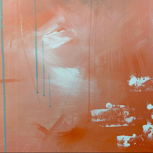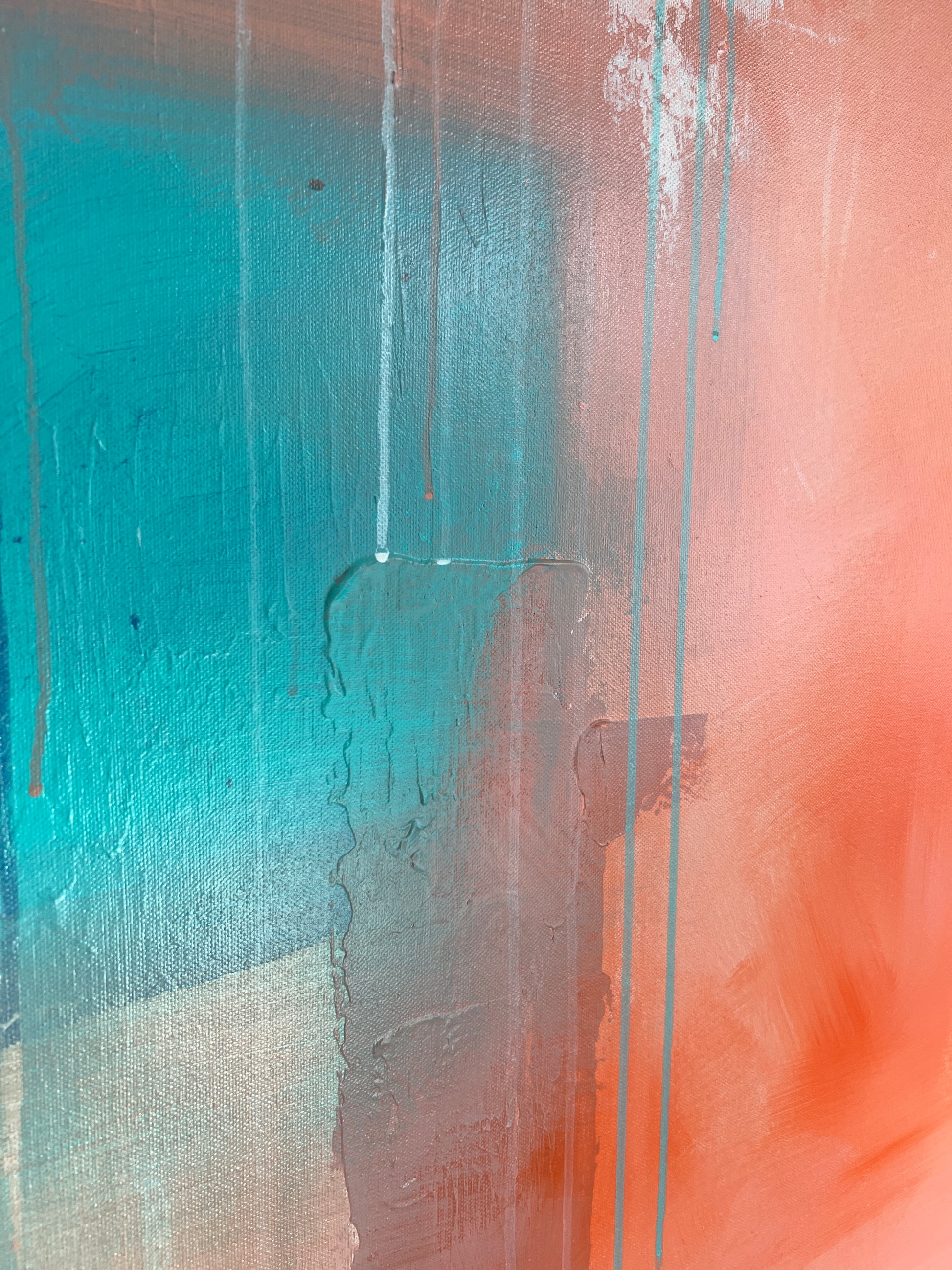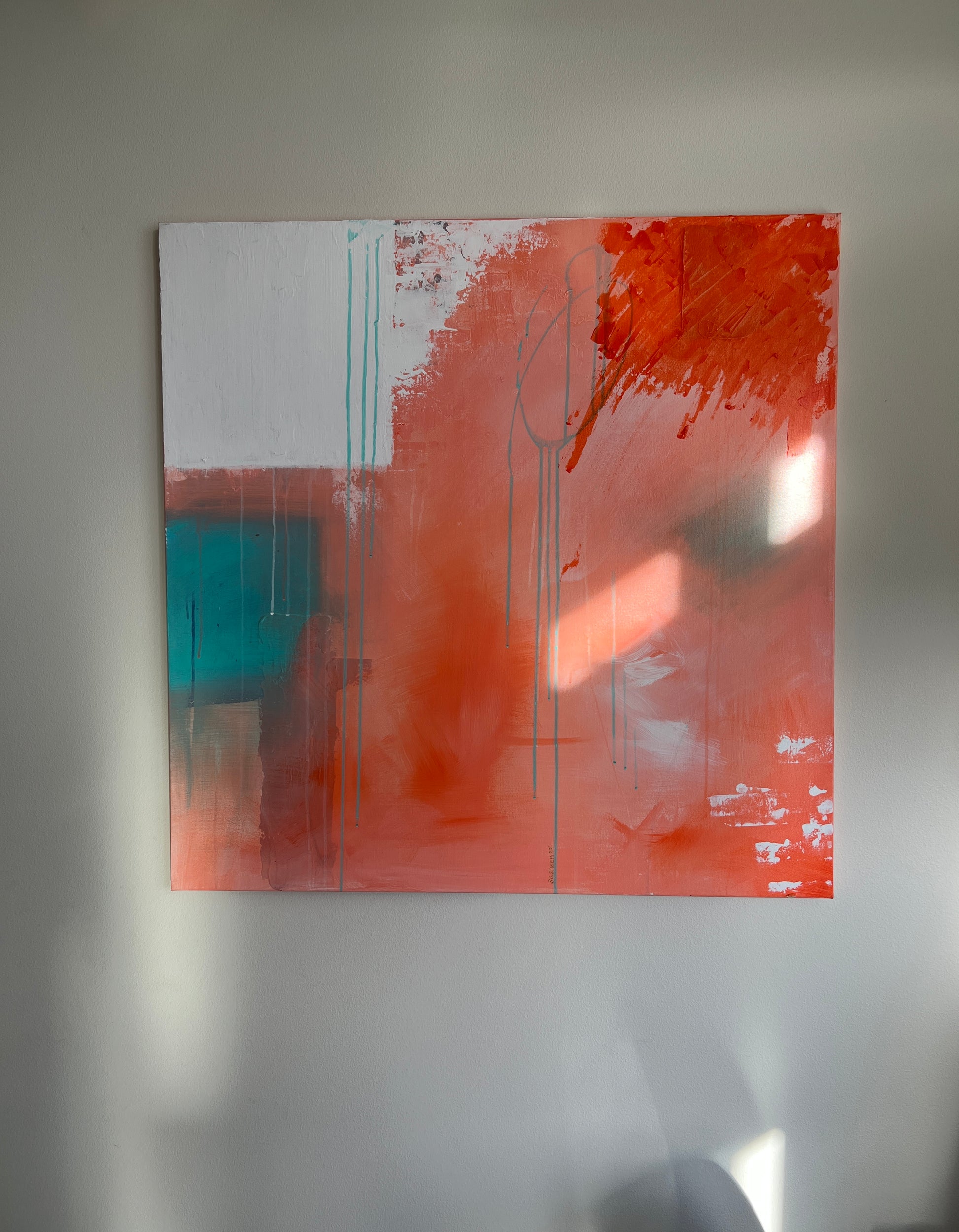 Bright abstract art piece! Size 36x36, thin edge. Perfect statement piece for a living or bedroom. Acrylic on Museum Wrapped Canvas.